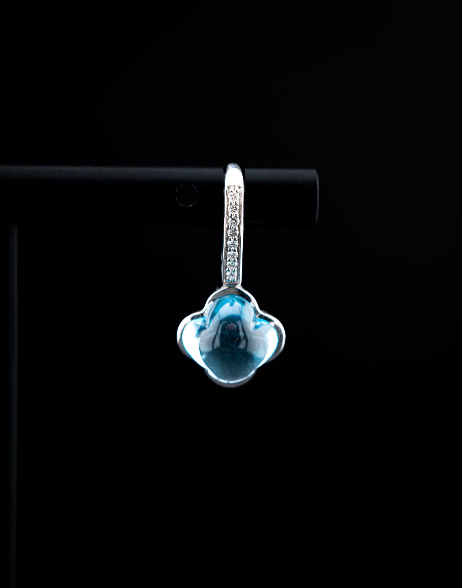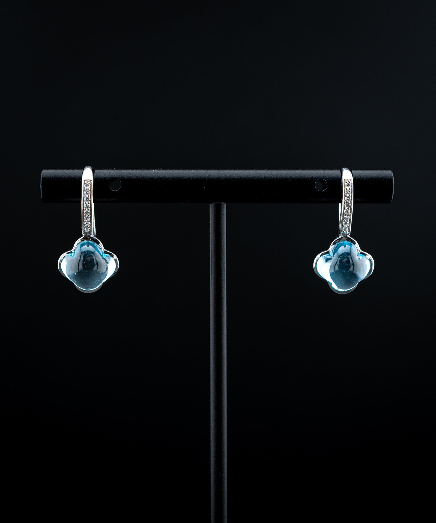 These Hulchi Belluni 18K white gold flower drop earrings combine the serene beauty of blue topaz with the refined sparkle of natural diamonds. A timeless statement of elegance and craftsmanship.