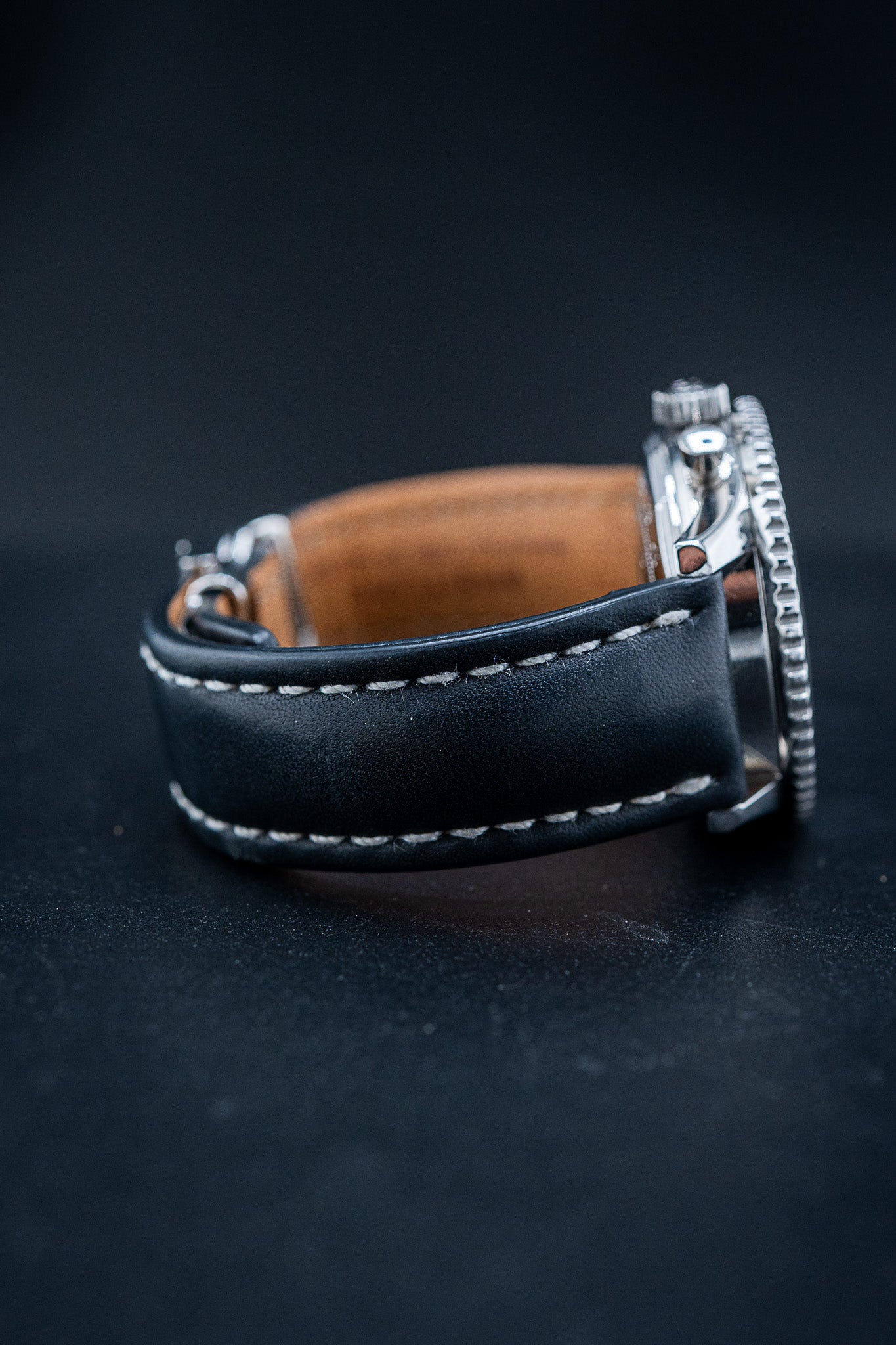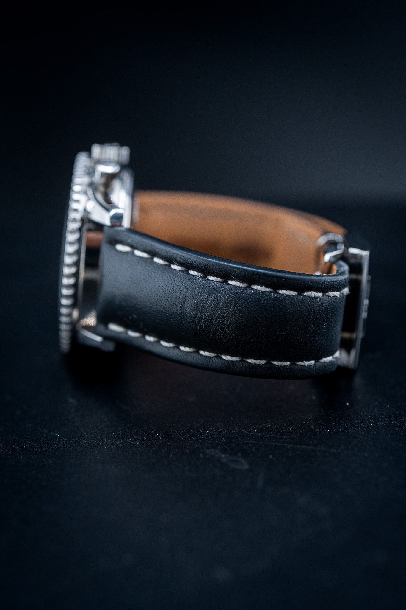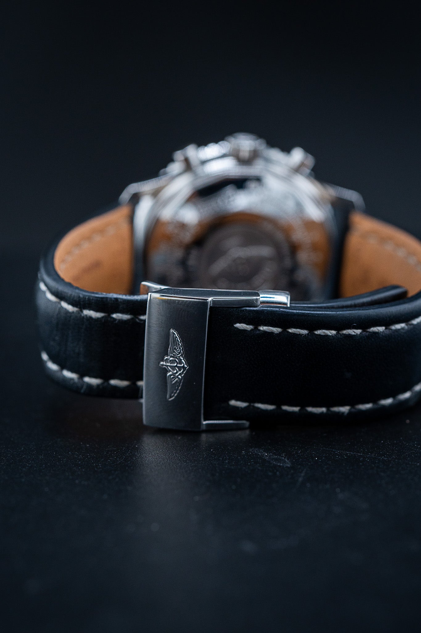 Bracelet/Strap: Black Leather Strap with Breitling Buckle